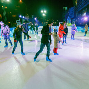 Gestaltung einer winterlichen Eiswelt mit Eisbahn und festlicher Dekoration, damit Besucher länger im Einkaufszentrum bleiben oder speziell wegen der Eisbahn kommen.