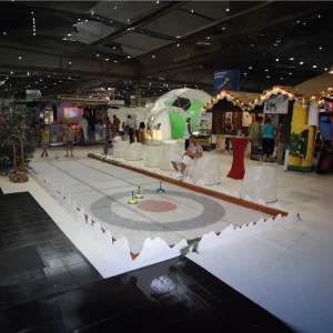 Wer in der Winterlandschaft eine zusätzliche Herausforderung sucht, ist beim Eisstockschießen genau richtig. Die bis zu 12 Meter lange Eisstockbahn bietet den eiskalten Spaßfaktor – allerdings ohne Eis. Die Länge der Bahn kann nach Ihren Wünschen angepasst werden.